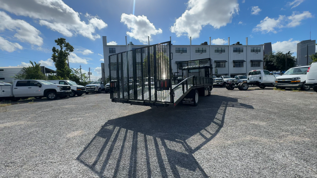 Upfit includes 14' Landscape bed, standard cab over 33.5" frame width 114.5" CA, 14' standard LS 5'6 Split, spring assist ramp, 15" side, both sides also have LS HB, cooler rack, rake holder, 18x18x36" steel underbody truck tool boxes.