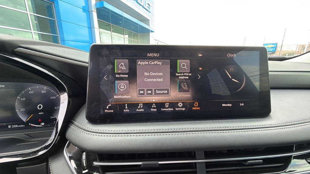 Performance Audio Package (Bose Performance Series 17-Speaker Sound System), 3rd row seats: bench, 4-Wheel Disc Brakes, 4.33 Axle Ratio, 9 Speakers, ABS brakes, Air Conditioning, Alloy wheels, AM/FM radio: SiriusXM, Anti-whiplash front head restraints, Apple CarPlay/Android Auto, Auto High-beam Headlights, Auto tilt-away steering wheel, Auto-dimming door mirrors, Auto-dimming Rear-View mirror, Automatic temperature control, Brake assist, Bumpers: body-color, Climate Controlled Front Bucket Seats, Delay-off headlights, Driver door bin, Driver vanity mirror, Dual front impact airbags, Dual front side impact airbags, Electronic Stability Control, Emergency communication system: INFINITI InTouch, Exterior Parking Camera Rear, Floor Mats w/Bench Seats on 3rd Row Tray, Four wheel independent suspension, Front anti-roll bar, Front Bucket Seats, Front Center Armrest, Front dual zone A/C, Front reading lights, Fully automatic headlights, Garage door transmitter: HomeLink, Heated door mirrors, Heated front seats, Heated steering wheel, Illuminated entry, Knee airbag, Leather Shift Knob, Leather steering wheel, Leather-Appointed Seating Surfaces, Literature Kit, Low tire pressure warning, Memory seat, Navigation system: INFINITI InTouch Navigation, Occupant sensing airbag, Outside temperature display, Overhead airbag, Overhead console, Panic alarm, Passenger door bin, Passenger vanity mirror, Power door mirrors, Power driver seat, Power Liftgate, Power moonroof, Power passenger seat, Power steering, Power windows, Radio data system, Radio: AM/FM Audio System, Rain sensing wipers, Rear air conditioning, Rear anti-roll bar, Rear reading lights, Rear seat center armrest, Rear side impact airbag, Rear window defroster, Rear window wiper, Reclining 3rd row seat, Remote keyless entry, Security system, Speed control, Speed-sensing steering, Speed-Sensitive Wipers, Splash Guards (Set of 4), Split folding rear seat, Spoiler, Steering wheel memory, Steering wheel mounted audio controls, Tachometer, Telescoping steering wheel, Tilt steering wheel, Traction control, Trip computer, Turn signal indicator mirrors, Variably intermittent wipers, Ventilated front seats, and Wheels: 20 x 8J Sporty Machined Aluminum Alloy.